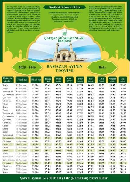 Qafqaz Müsəlmanları İdarəsinin (QMİ) Qazılar Şurasının fətvasına əsasən, müqəddəs Ramazan ayının ilk günü martın 1-nə təsadüf edəcək. Orucluğun başa çatması münasibətilə qeyd olunan Fitr bayramı martın 30-31-nə təsadüf edir. Ramazan ayının başlaması və bayram günləri Azərbaycan Milli Elmlər Akademiyasının Şamaxı Astrofizika Rəsədxanasının hesablamaları əsasında müəyyən edilir.