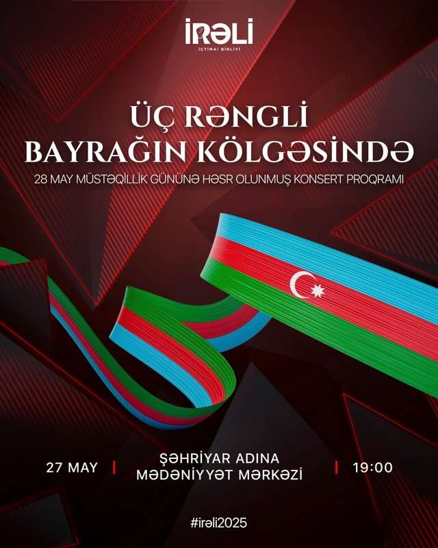 İRƏLİ" İctimai Birliyinin təşkilatçılığı, Şəhriyar adına Mədəniyyət Mərkəzinin dəstəyi, Azərbaycan Dövlət Uşaq Filarmoniyasının iştirakı ilə 28 may - Müstəqillik gününə həsr olunmuş "Üçrəngli Bayrağın Kölgəsində" adlı konsert keçirilib.