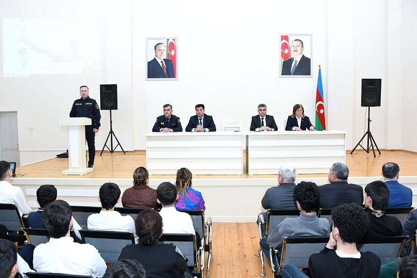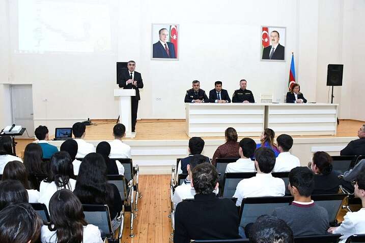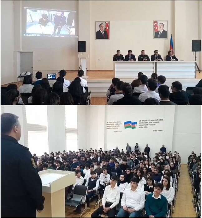 Rayon Polis şöbəsinin rəisi, polis-polkovniki Azay Ağayev və təhsil sektorunun müdiri Elman Rzayev gənclər arasında narkomaniya, qadağan olunmuş əşyaların məktəbə gətirilməsi, erkən nikah və digər risklər barədə çıxış ediblər.