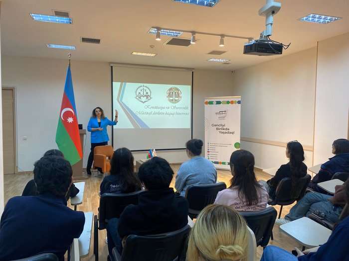Azərbaycan Respublikası Vəkillər Kollegiyasının üzvü, “Hüquqi Sosial Araşdırmalar və Maarifləndirmə Mərkəzi”nin həmtəsisçisi və idarə heyətinin sədri, Ədliyyə Nazirliyinin yanında Məhkəmə Ekspertizası Mərkəzinin doktorantı Esmira Tağıyevanın təqdimatında keçirilən təlimdə gənclər hüquqi dövlətin əsasları, qanunvericilik sahəsindəki yeniliklər və hüquqi maarifləndirmənin əhəmiyyəti ilə bağlı ətraflı məlumatlar əldə ediblər.