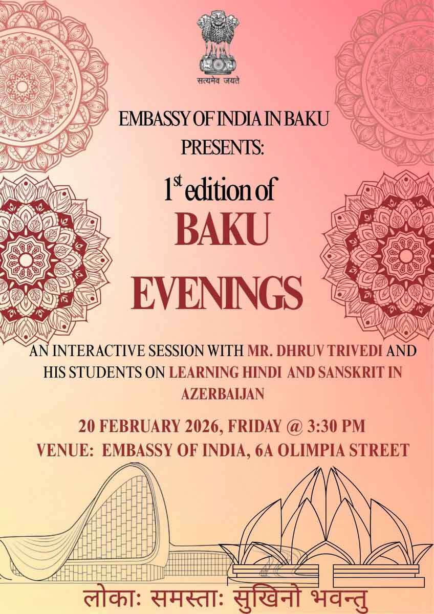 The Embassy of India in Baku successfully hosted the inaugural session of Baku Evenings on February 20, 2026 — a vibrant interactive gathering focused on learning and celebrating India's ancient and living languages, Sanskrit and Hindi. The event featured Mr. Dhruv Trivedi, Lecturer of Sanskrit and Hindi at the Azerbaijan University of Languages, along with his enthusiastic students. Ambassador Abhay Kumar, an acclaimed writer, artist and language enthusiast himself, engaged directly with the young students, who shared their passion through recitations of timeless Sanskrit shlokas, lively Hindi conversations, and insightful discussions on Indian culture and literature. Participants highlighted the profound wisdom embedded in Sanskrit texts and the expressive vibrancy of modern Hindi, underscoring the growing interest in Indian languages among Azerbaijani youth. The session fostered meaningful cultural exchange and strengthened people-to-people ties between India and Azerbaijan. The session witnessed participation from members of Indian diaspora, including Indian students and a group of social media influencers from Azerbaijan. The evening concluded on a warm and flavorful note with an authentic spread of Indian delicacies, allowing attendees to experience a taste of India's rich culinary heritage alongside its linguistic traditions. Ambassador Abhay Kumar expressed delight at the event's success, stating: “Initiatives like Baku Evenings bring alive the shared values and cultural affinities between our two nations. We are inspired by the dedication of the young Azerbaijani students, and look forward to many more such enriching interactions.” This inaugural edition marks the beginning of Baku Evenings — a new Embassy series aimed at promoting Indian culture, education, arts, and heritage through engaging community events in Azerbaijan.