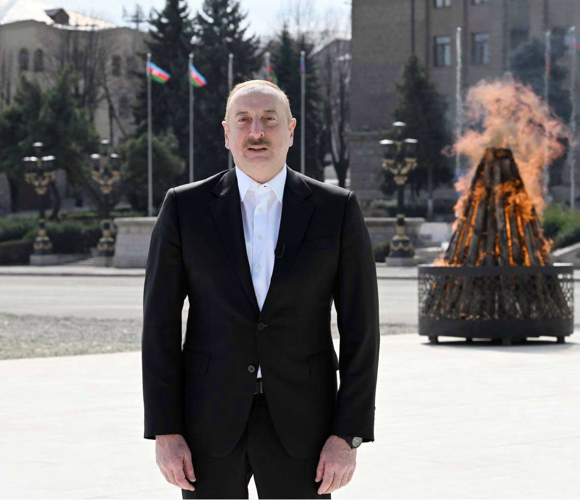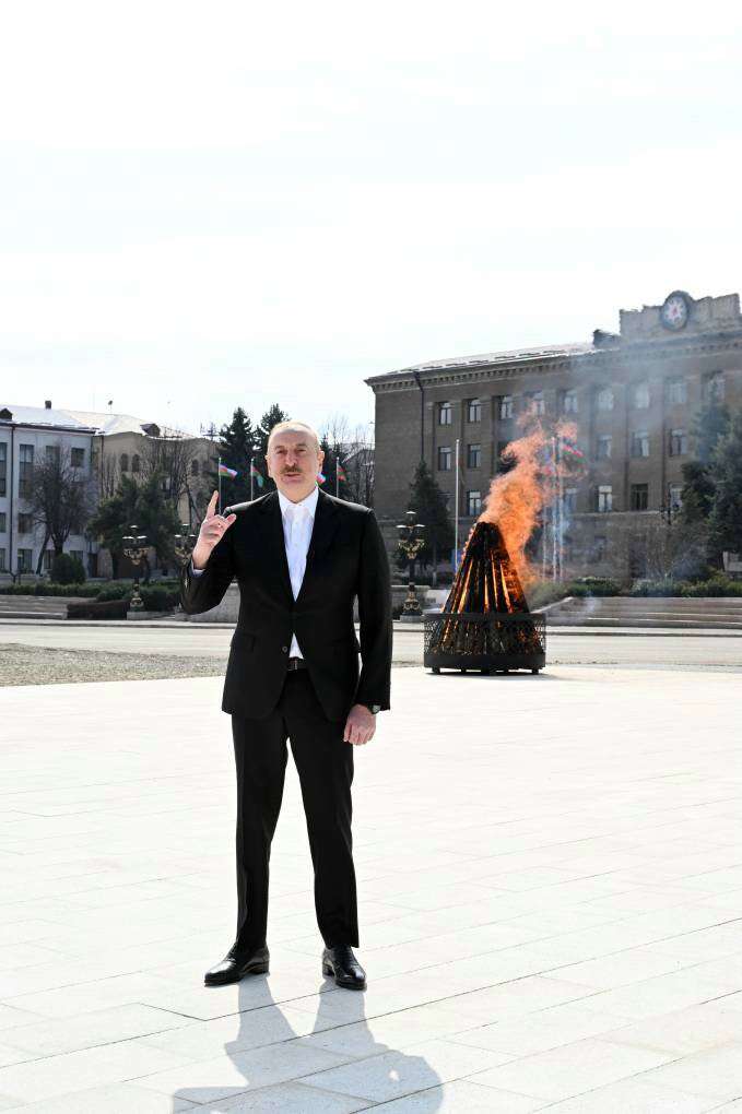 Dördüncü dəfədir ki, bayram tonqalını mən azad edilmiş Qarabağ torpağında qalayıram. 2021-ci ildə Şuşada, 2022-ci ildə Suqovuşanda, keçən il Talış kəndində, bu dəfə isə Xankəndi şəhərində bayram tonqalı qalanır. Bu, böyük xoşbəxtlikdir. Altı ay bundan əvvəl cəmi bir gündən az davam edən antiterror əməliyyatı nəticəsində biz öz suverenliyimizi tam bərpa etdik və bu gün Azərbaycan ərazisində ölkəmizin ərazi bütövlüyü tamamilə təmin edilmişdir.