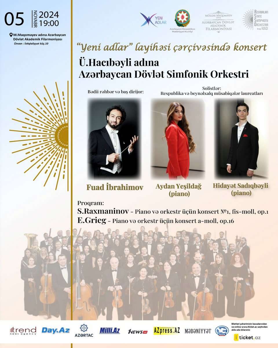 5 noyabr tarixində M.Maqomayev adına Azərbaycan Dövlət Akademik Filarmoniyasının səhnəsində “Yeni adlar” layihəsi çərçivəsində konsert keçirilib. Bədii rəhbər və baş dirijor Azərbaycan Respublikasının Əməkdar artisti Fuad İbrahimovun rəhbərliyi, Ü.Hacıbəyli adına Azərbaycan Dövlət Simfonik Orkestrinin müşayiəti ilə solistlərRespublika və beynəlxalq müsabiqələr laureatları Aydan Yeşildağ (piano), Hidayət Sadıqbəyli (piano) dinləyicilər qarşısında çıxış edib. Proqramda S.Raxmaninov piano və orkestr üçün 1 saylı konsert (fis-moll, op.1) və E.Grieg piano və orkestr üçün konsert (a-moll, op.16) səslənib. Məlumat üçün nəzərinizə çatdıraq ki, “Yeni adlar” müasir Azərbaycan ifaçılıq sənətinin inkişafına, bu sahədə yeni istedadlı nəslin tanınmasına, parlaq ifaçıların yetişməsinə xidmət edən layihədir.